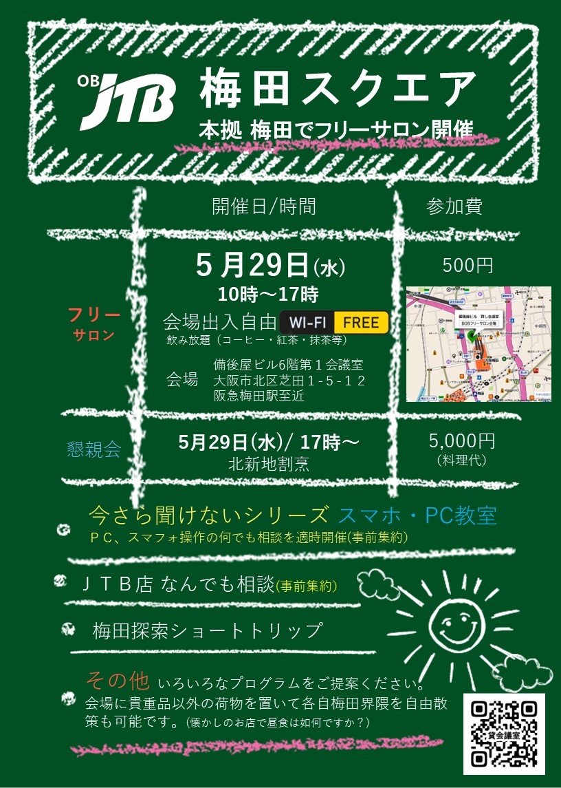 来月5月29日(水)に、阪急梅田駅近くの貸しスペース(会議室)を利用し、新たな試みで「フリーサロン」を開催します。全国のBOB会員の皆様で、当日大阪にお越しであれば、是非ご参加ください 開催時間中は、会場への出入りはBOB会員であれば自由です。 懇親会以外は直接のご来場でOKですが、参加人員把握のため下記参加フォームをクリックしできるだけご回答ください。 参加フォーム ご回答後の変更などは、BOB会関西支部あてメールアドレス(bobwest2018mail@gmail.com)又は、支部役員へ、ご連絡ください。