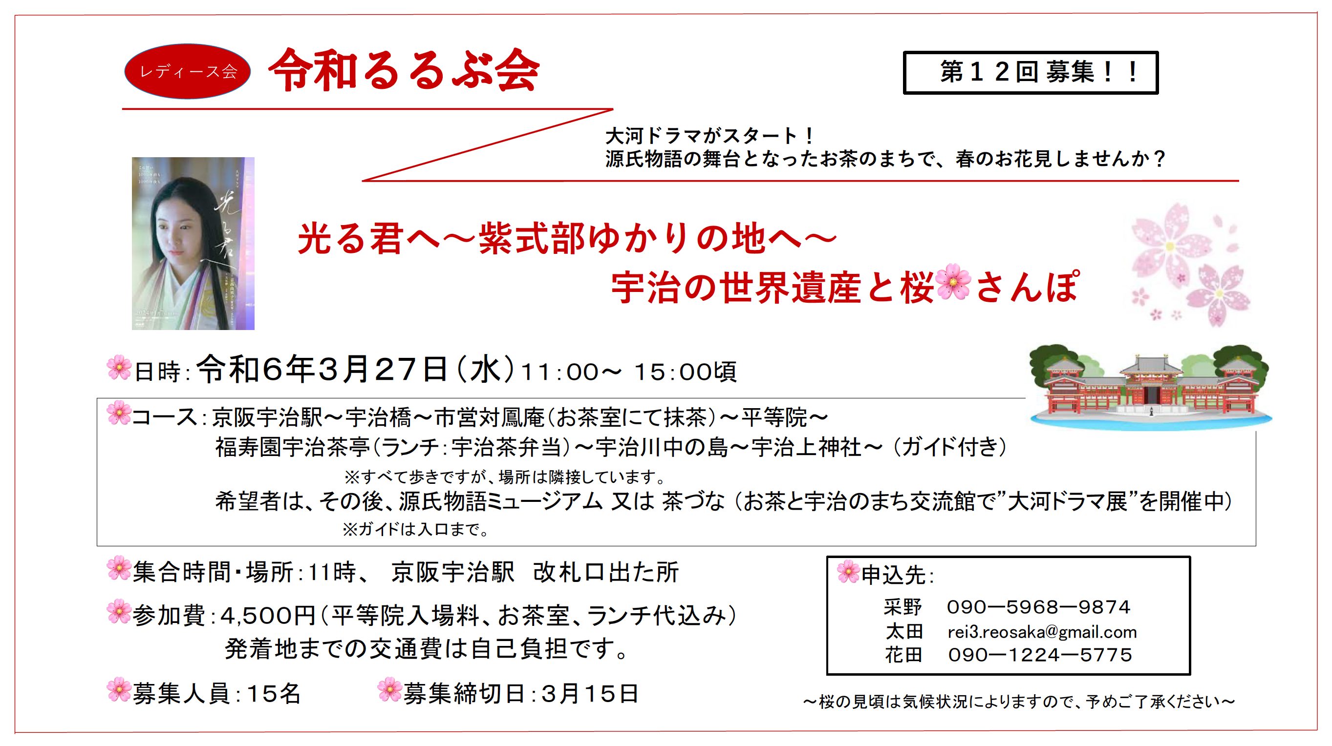 桜の開花には少し早かったですが、幸運にも晴天に恵まれ、13名が集いました。今回は、大河ドラマがスタートしたこともあり、源氏物語の作者紫式部ゆかりの地、京都の宇治を歩いて廻りました。
