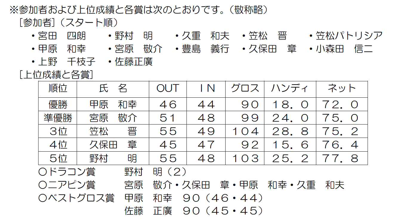 募集段階では15名の方のエントリーがありましたが、3名の方々のキャンセルにより、最終的には12名での参加となりました。ゴルフ場のご厚意もあり、3名✕4組でのゆったりとした組み合わせ、明け方までの雨を感じさせない素晴らしいコンディションで、18ホールのラウンドを楽しみました。今回少なめの参加者ではありましたが、ラウンド後は、少人数ならではの賞品獲得確率の高さから、次は自分の番かと順位発表を期待しながらの表彰式で、和気あいあいと盛り上がりました。