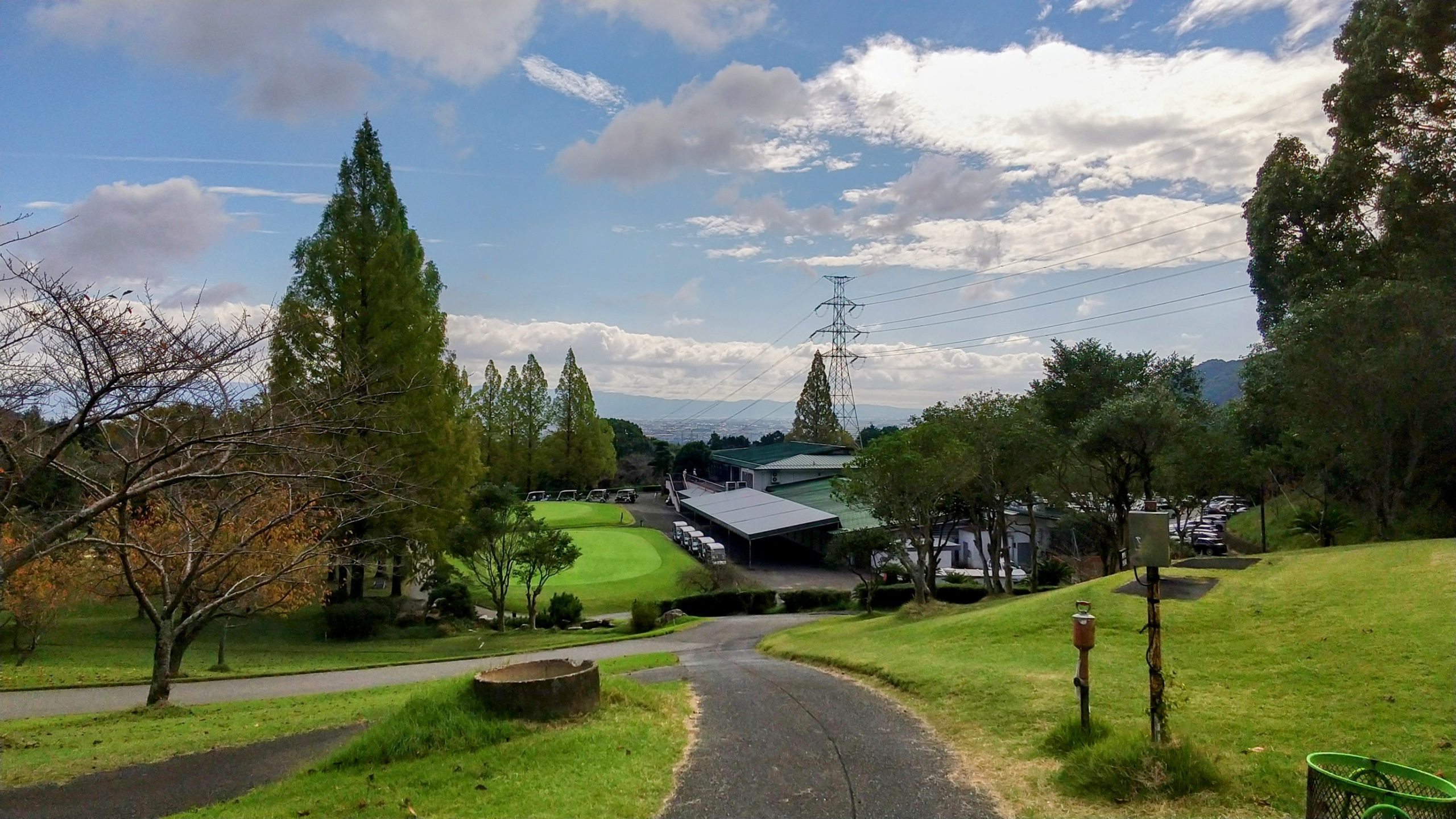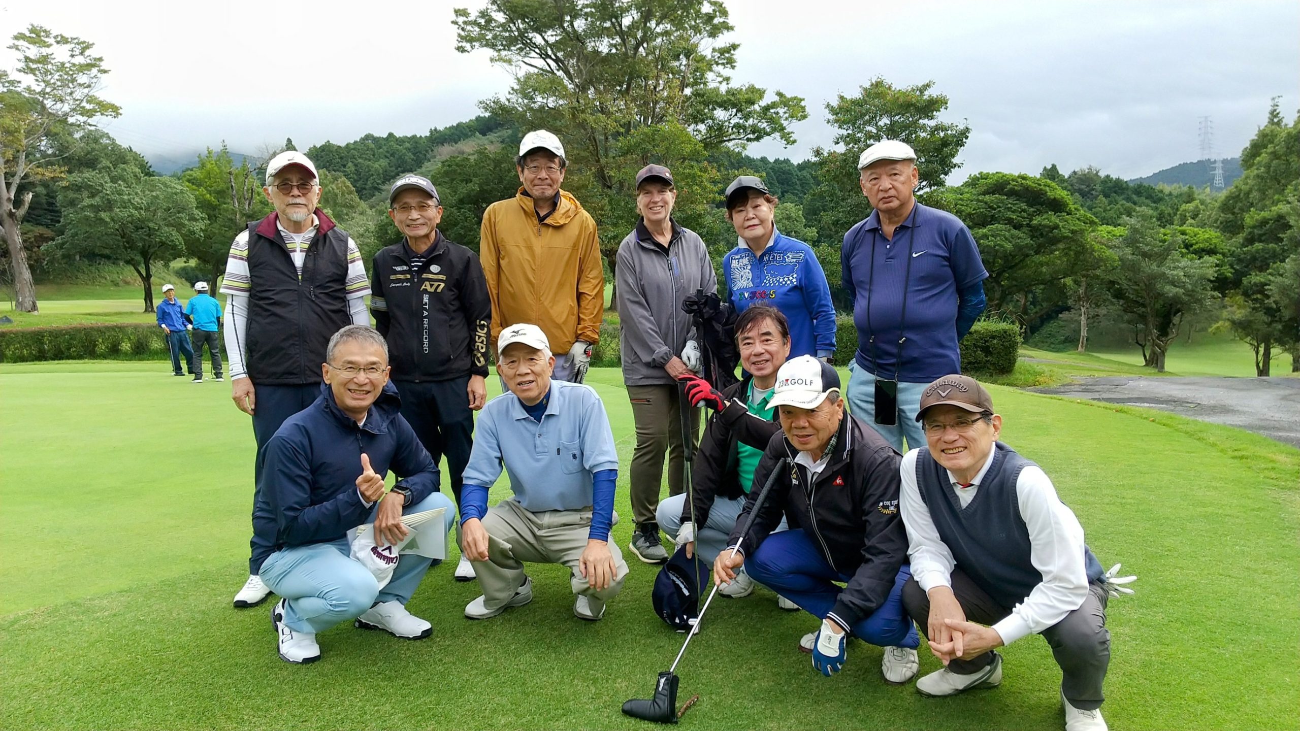 この半年間、九州支部の野外行事、観桜会・春季グラウンドゴルフ大会・春季ゴルフ大会・秋季グラウンドゴルフ大会と4大会連続して、雨天のため中止となってしまいました。今回も前日夕方から雨が降り出し、夜半から本降り、午前5時頃まで降り続く状況で、開催が危ぶまれました。しかし、参加者がゴルフコースに集合する時間には雨も止み曇り空、後半のラウンドでは青空も顔を出し、日も差すまでの天候に回復しました。
