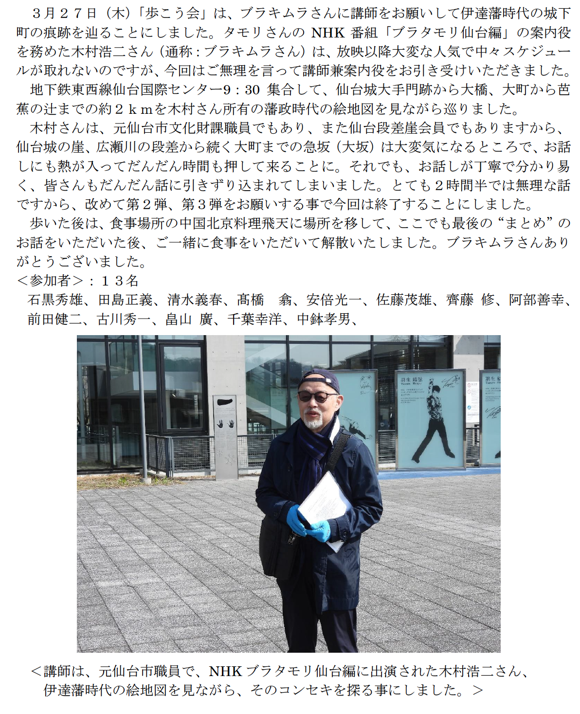 3月27日(木)城下町仙台~現在も残る藩政期のコンセキを辿る~ コメントを残す コメントをキャンセルメールアドレスが公開されることはありません。 ※ が付いている欄は必須項目ですコメント ※ 名前 ※ メール ※ サイト 次回のコメントで使用するためブラウザーに自分の名前、メールアドレス、サイトを保存する。