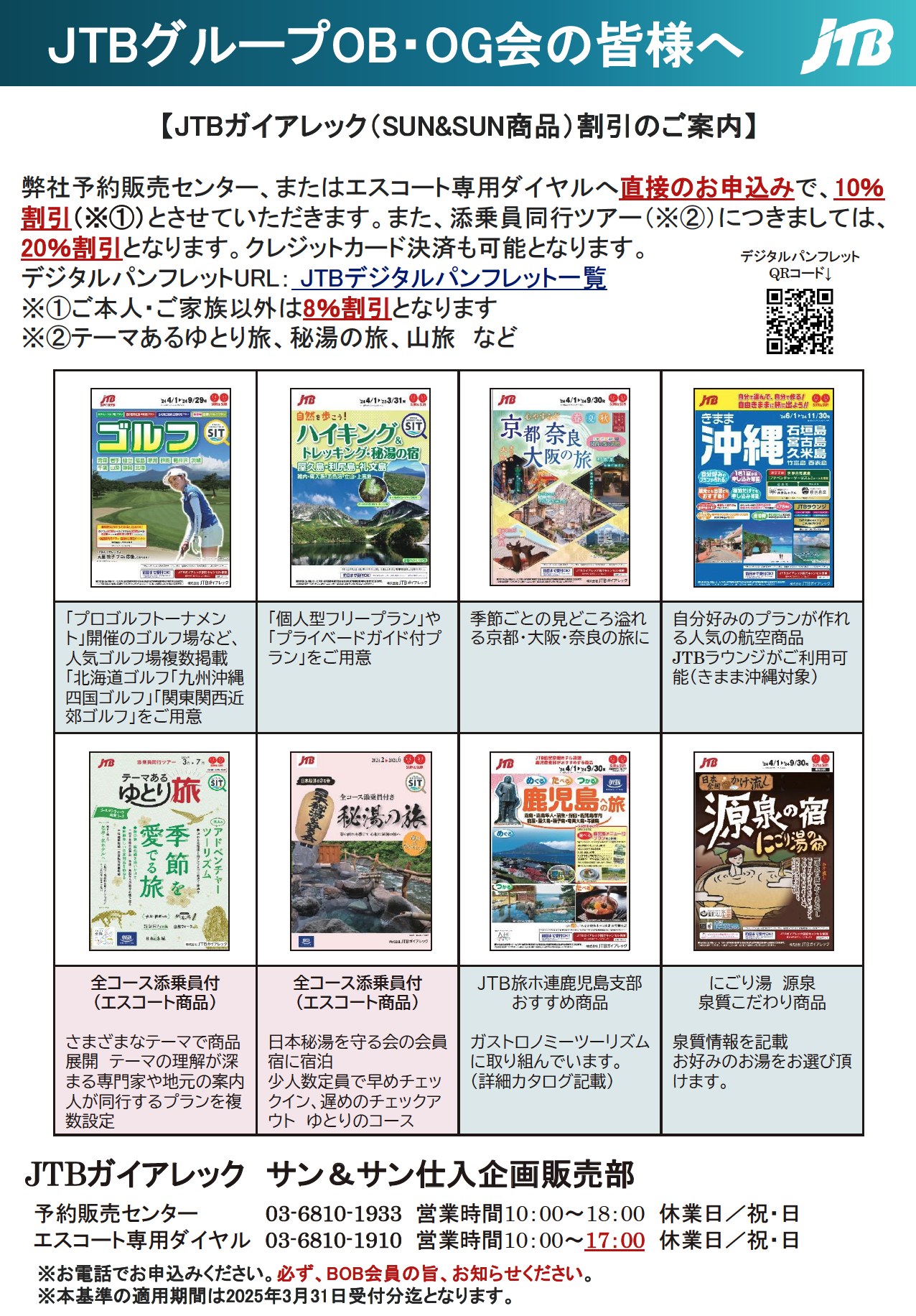 弊社予約販売センター、またはエスコート専用ダイヤルへ直接のお申込みで、10%割引(※①)とさせていただきます。また、添乗員同行ツアー(※②)につきましては、20%割引となります。クレジットカード決済も可能となります。デジタルパンフレットURL:JTBデジタルパンフレット一覧