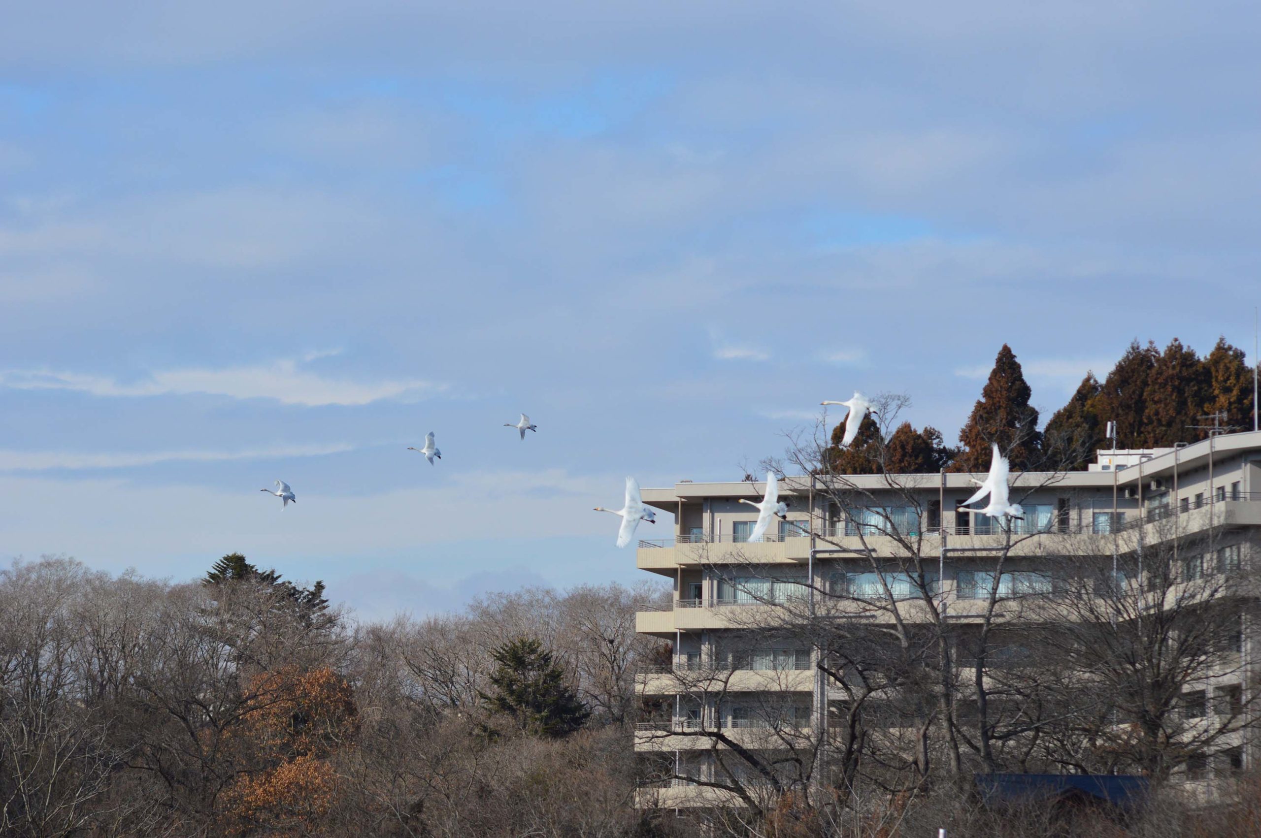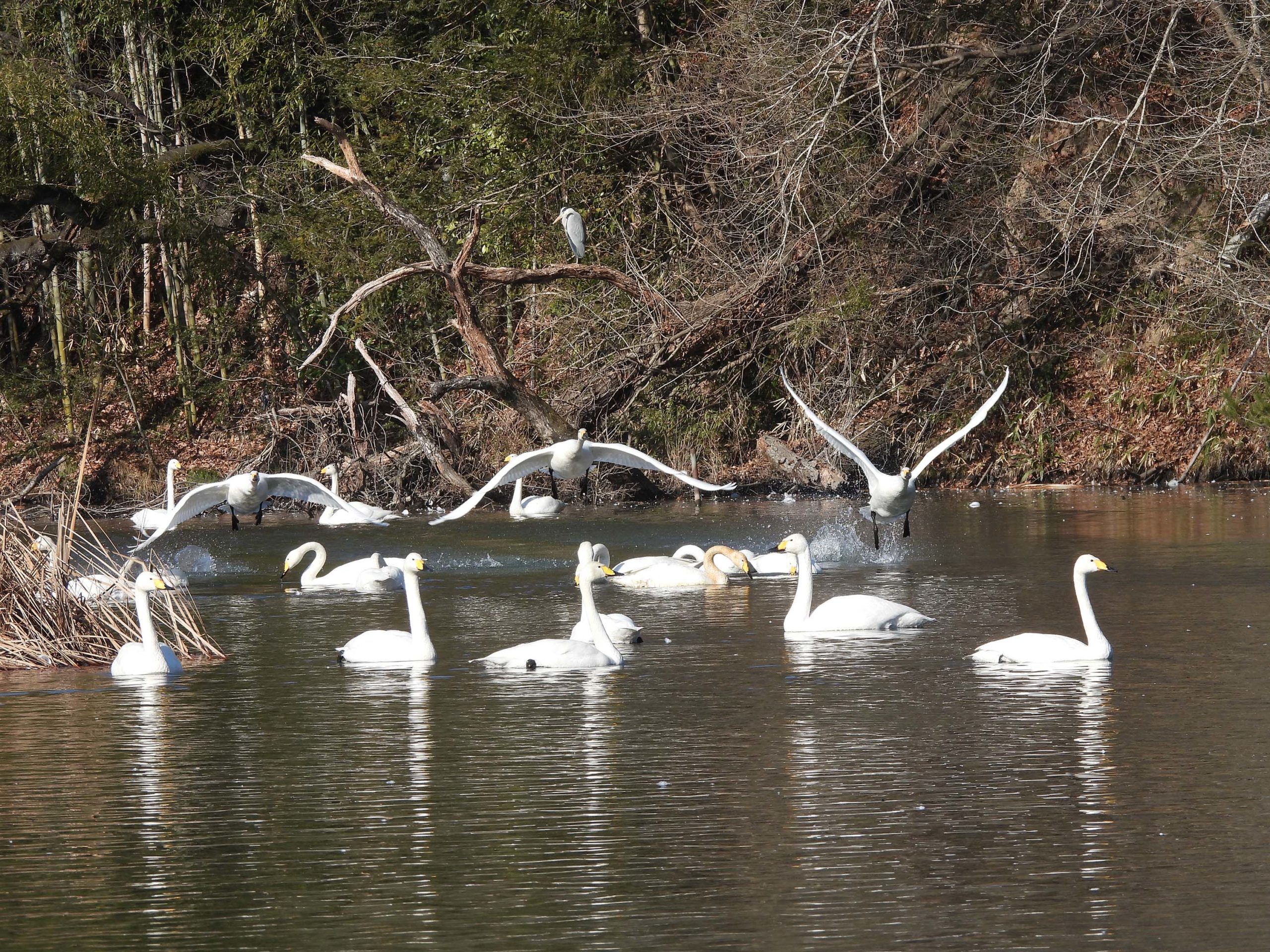 ③説明 :水の森公園内の沼に越冬している白鳥は約120羽で、毎朝餌場となっている近くの田んぼに向かって飛び立ちます。今日は、いつもよりは遅く10時頃に次々と飛び立っていきました。白鳥達は2月中旬頃から北帰行が始まります。
