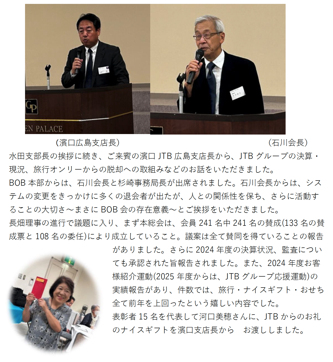 2025年度支部総会・講演会・懇親会が、7月16日(水)に広島ガーデンパレス響の間で開催されました。連日の猛暑、熱中症警戒アラートで外出自粛が発令される中、25名の会員にお集まりいただきました。今回は初の試みとして、事前に議案の賛否をハガキで集約する書面総会とし、新たに講演会を設けました。