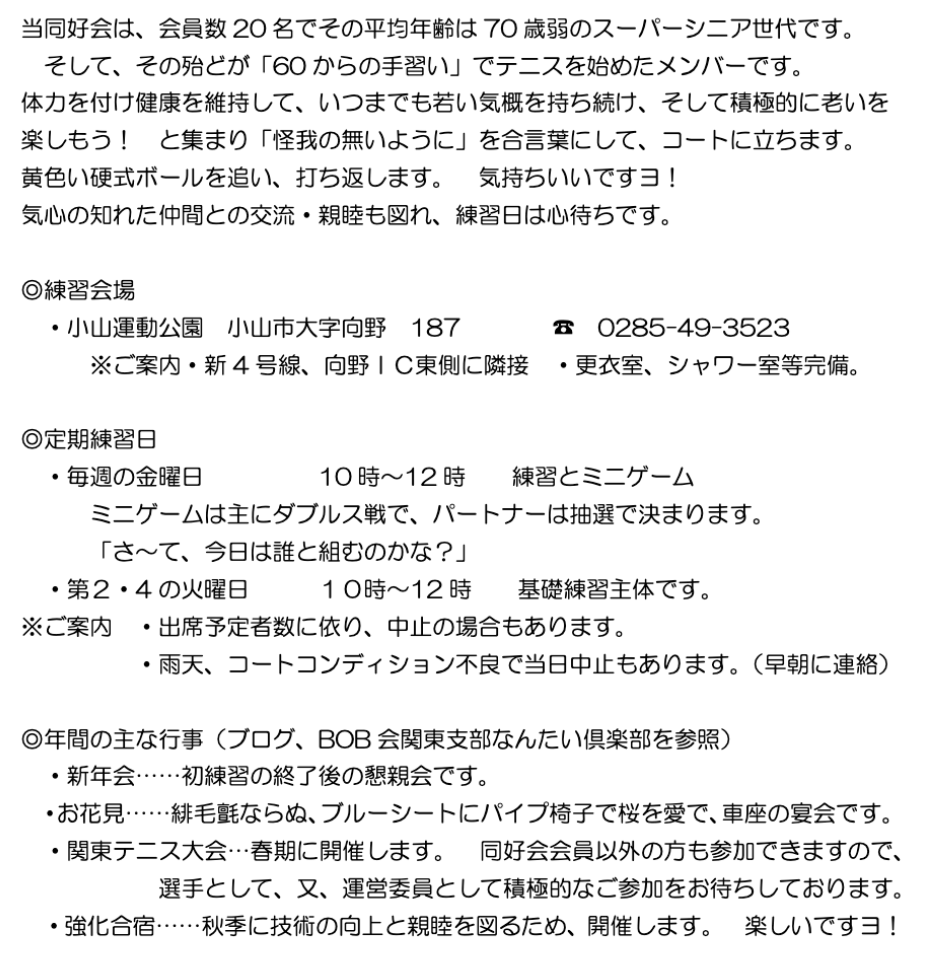 テニス同好会について(ご案内) 担当世話人 宮本 勲 電話番号 BOB関東支部テニス同好会ホームページ(参照ください) 20260403 第17回お花見会(募集) 20251031 第13回関東テニ大会(報告) 20250328 第16回お花見会(報告)